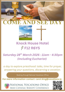 Thinking about a calling to serve God, Join us for an in-person gathering Retreat designed to help you explore the path to the diocesan priesthood. It’s a relaxed space to reflect, ask questions, and connect with others on the same journey. Come as you are and take time to listen to where your heart might be leading you!. For more information please email the Vocations Office, @ carol.king@vocations.ie or your local Vocations Director. If you a are unsure who your local director is, email the vocations office, @ info@vocations.ie or carol.king@Vocations.ie, who will be happy to assist you.